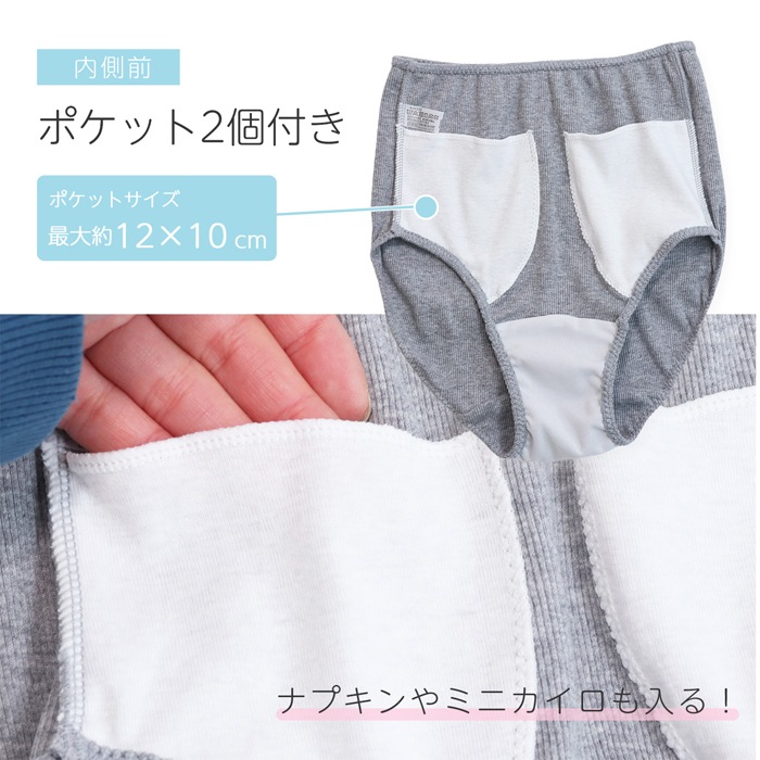 内側前に大きいポケット2コ付きで予備ナプキンやカイロなど用途に合わせて持ち運べてとっても便利♪