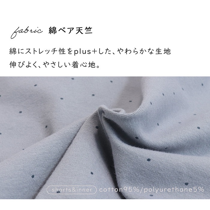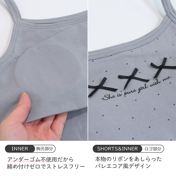 | 組成 | キャミソール|綿95%/ポリウレタン5% ショーツ|身生地 綿95%/ポリウレタン5% ゴム部分:ナイロン85%/ポリウレタン15% |
